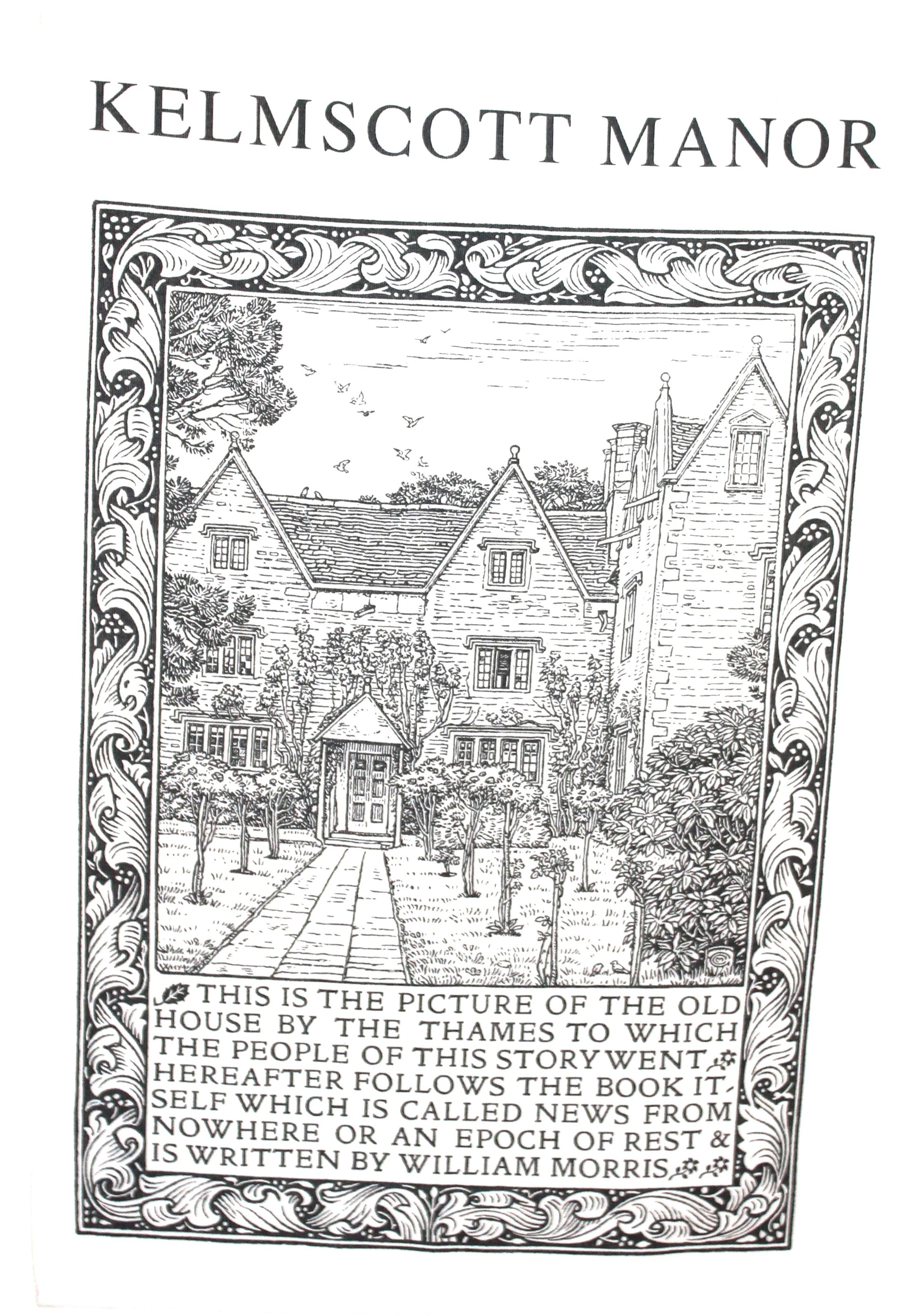 The Frontispiece from William Morris's News from Nowhere (Kelmscott Press 1892) showing the east front of Kelmscott Manor. Made in the UK. 52% linen and 48% cotton.