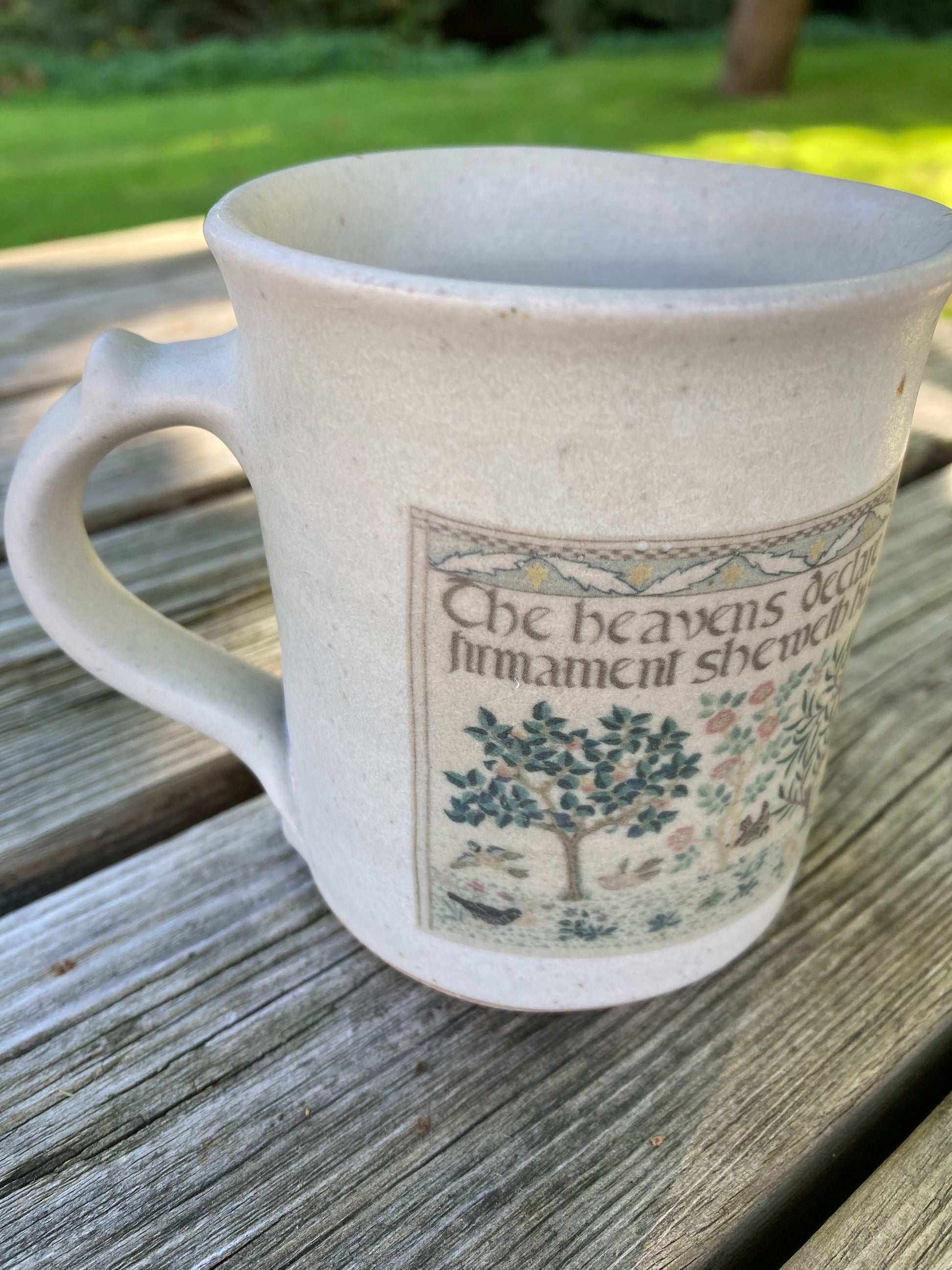 Hand thrown mug featuring Heavens Declare panel by May Morris - 1910-1920